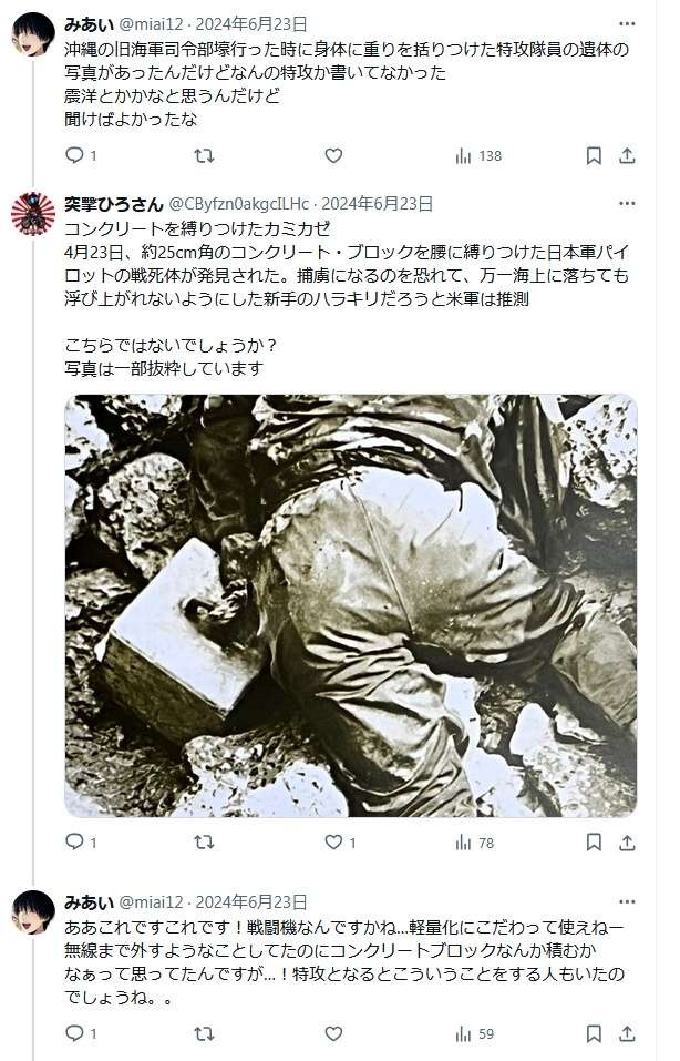 特攻隊員、わざと不時着水して生き延びられないように出撃時にコンクリートブロックを身体に巻き付けられていた模様…