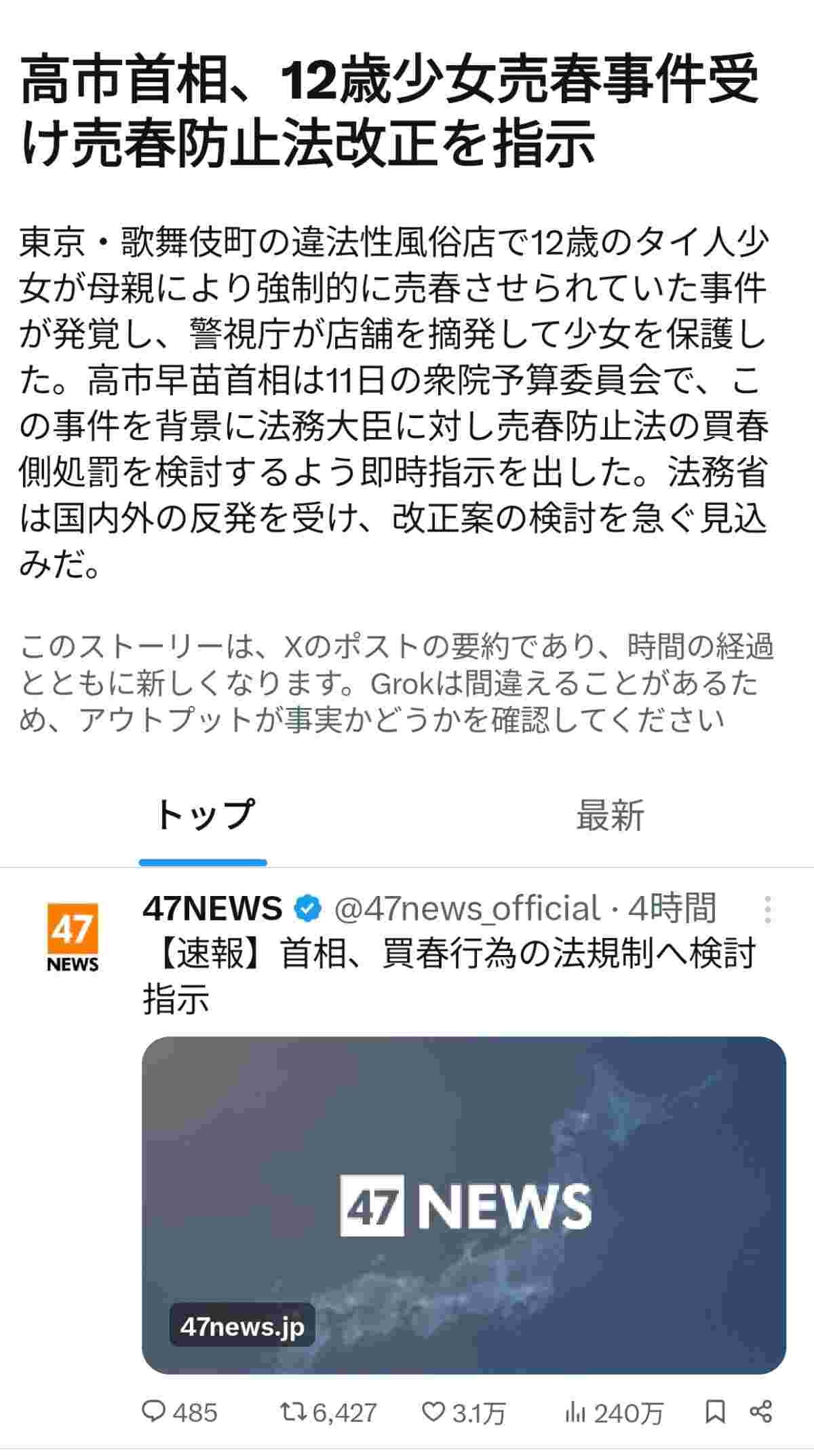 高市、12歳少女の売春摘発を受けて買春行為の法規制へ