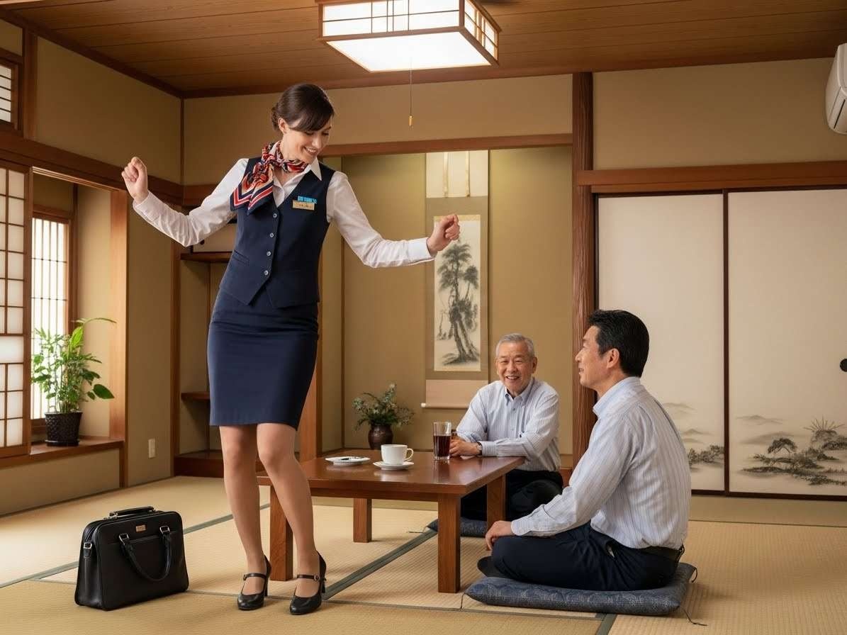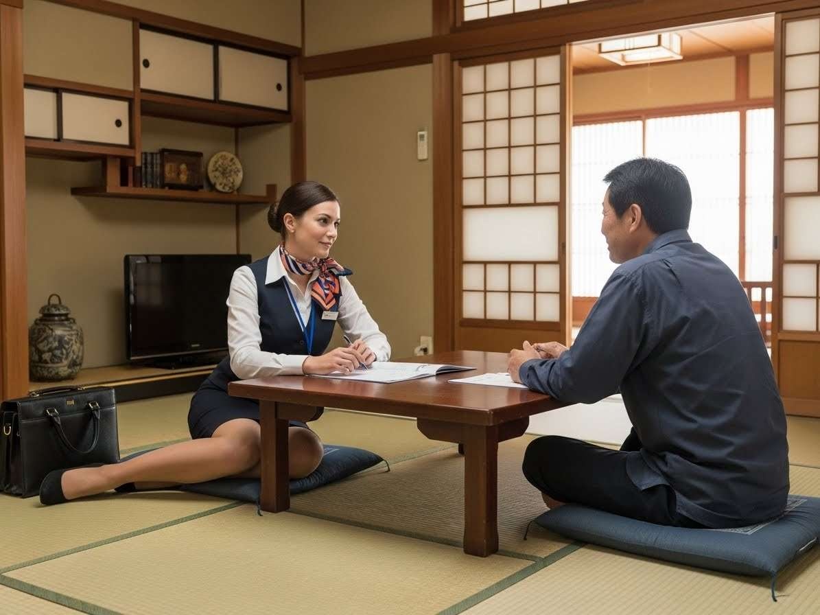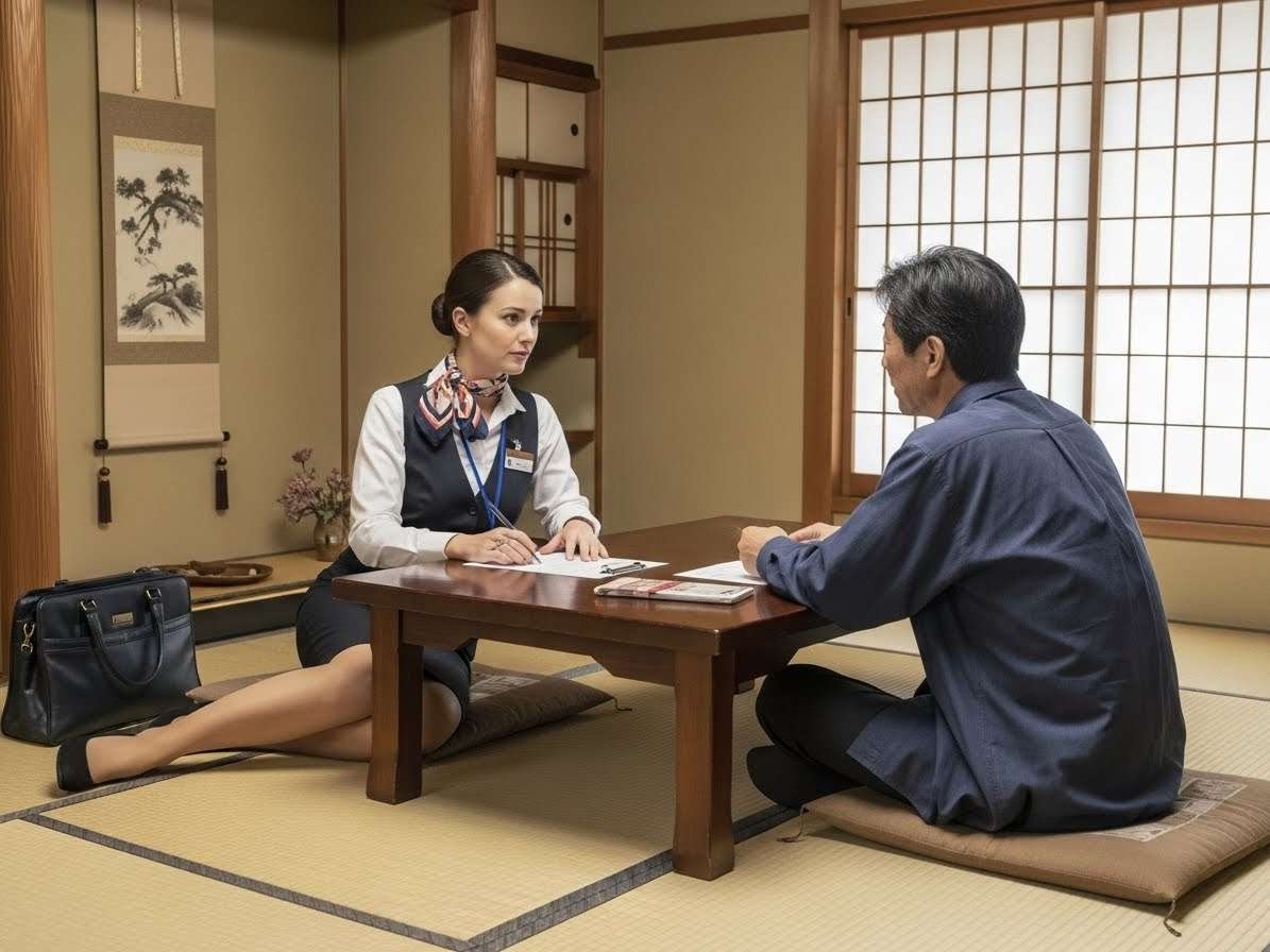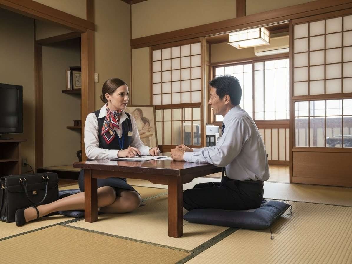 - 畳の部屋にヒールで上がる農協の共済のセールスレディの画像を作って。セールスレディはフランス人で