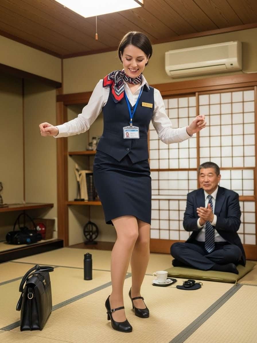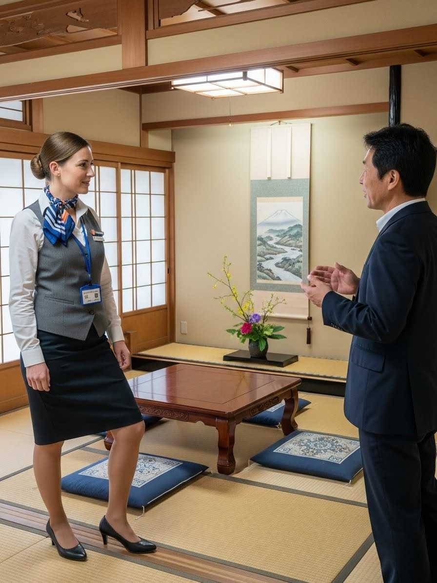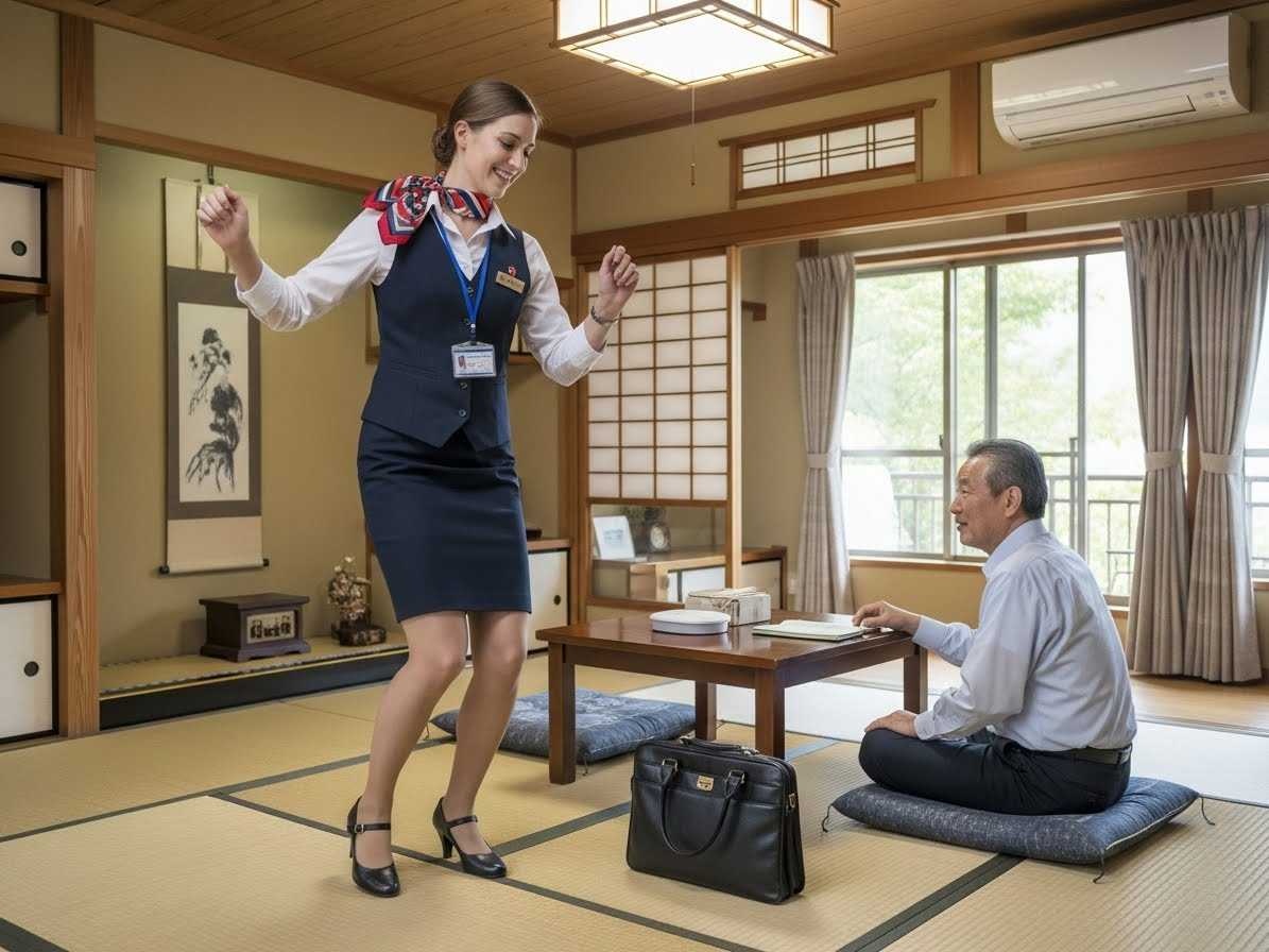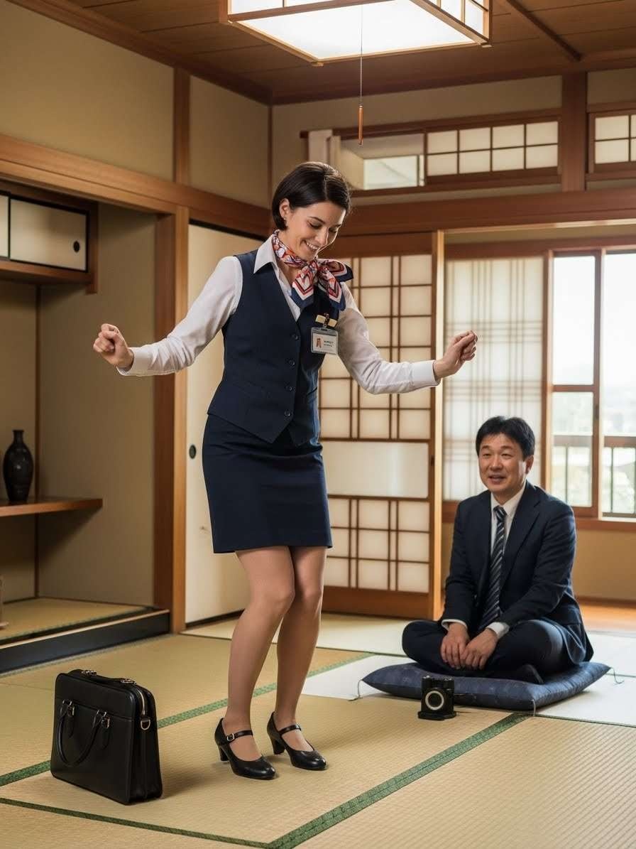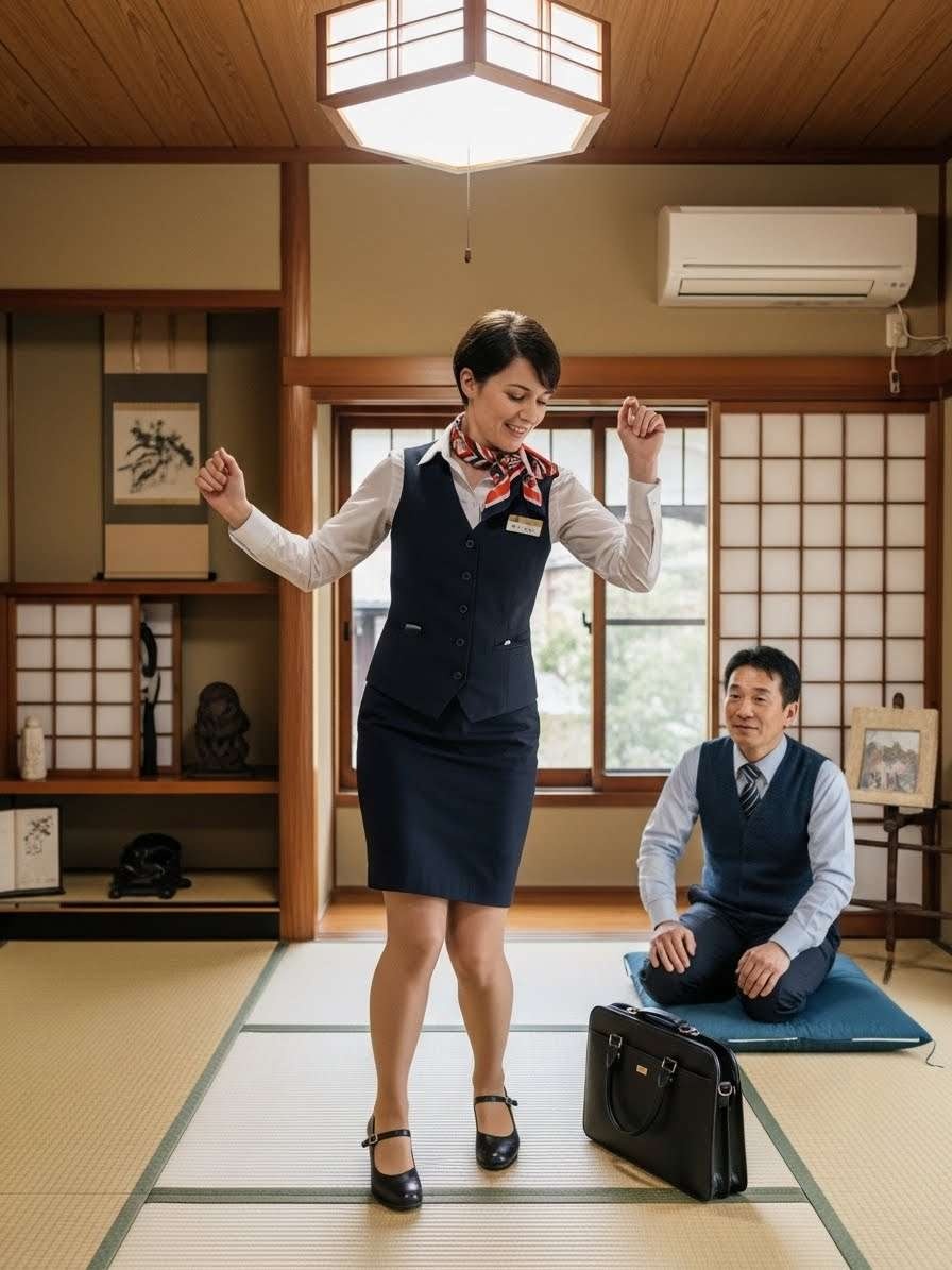 - 畳の部屋にヒールで上がる農協の共済のセールスレディの画像を作って。セールスレディはフランス人で
