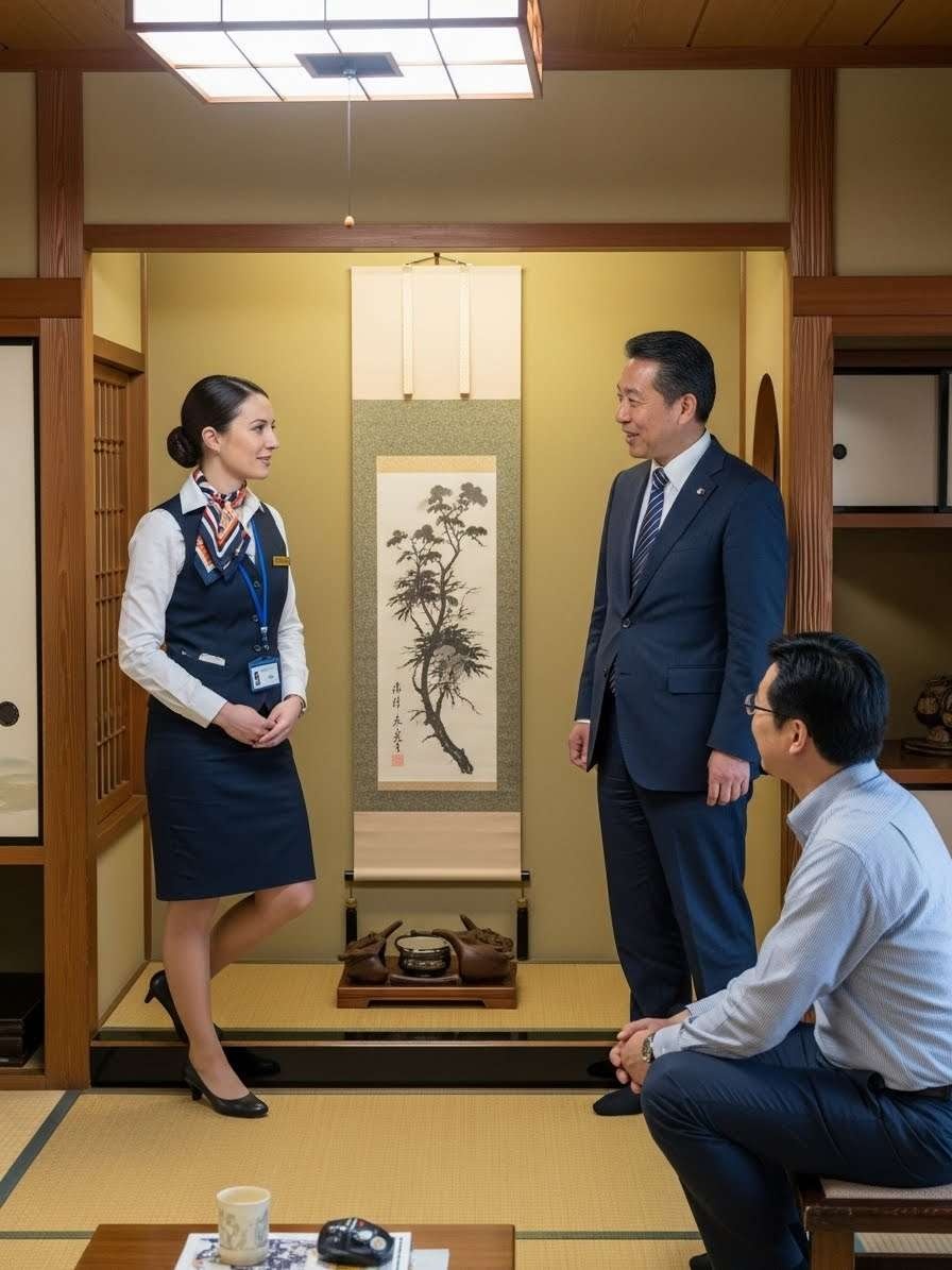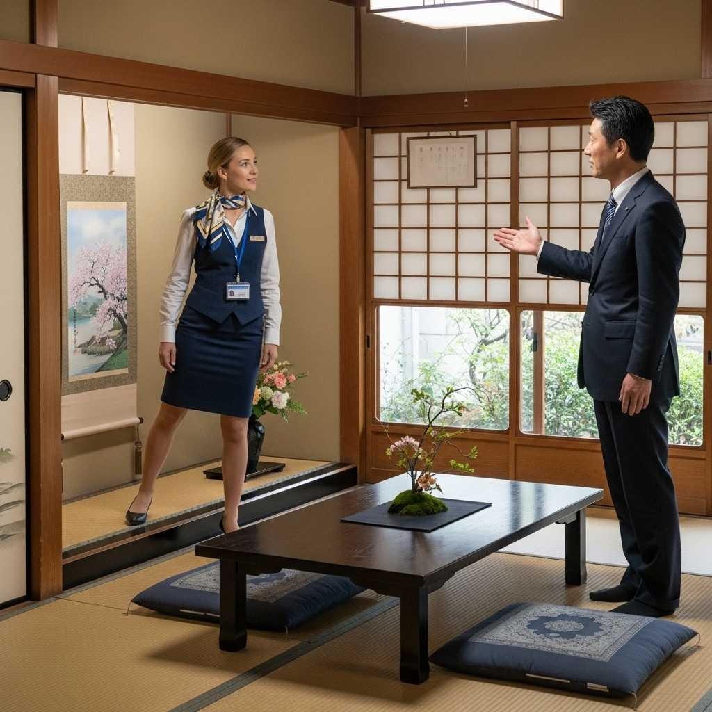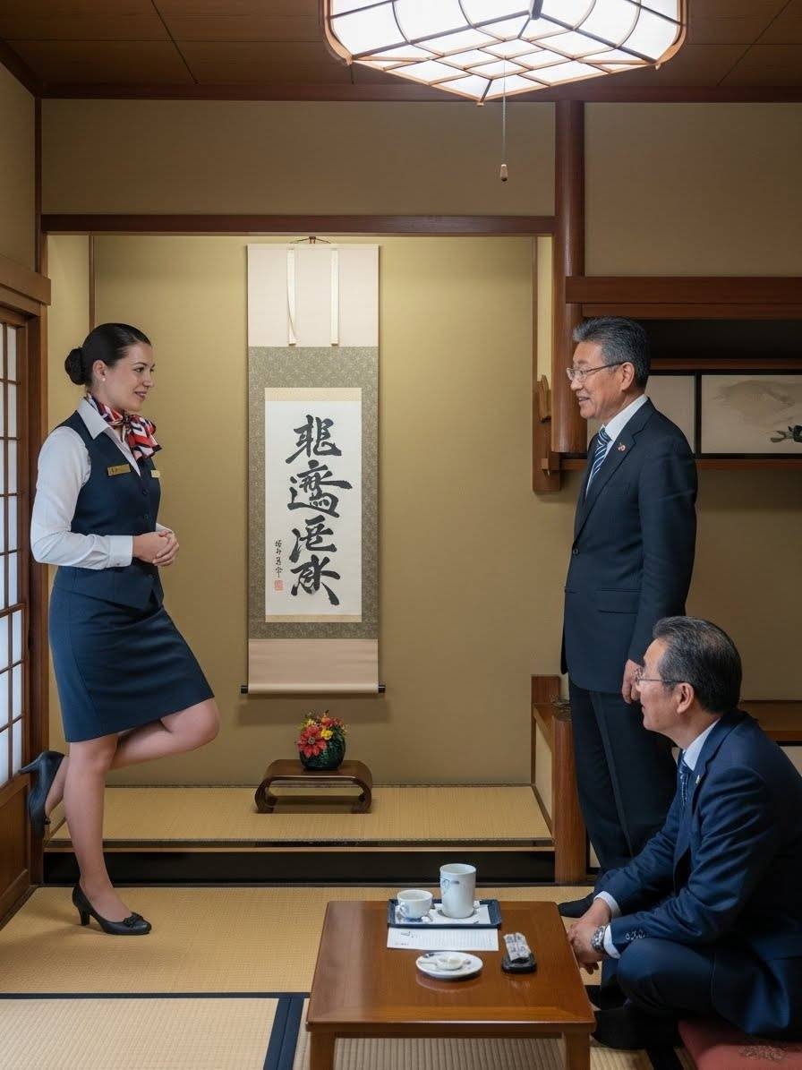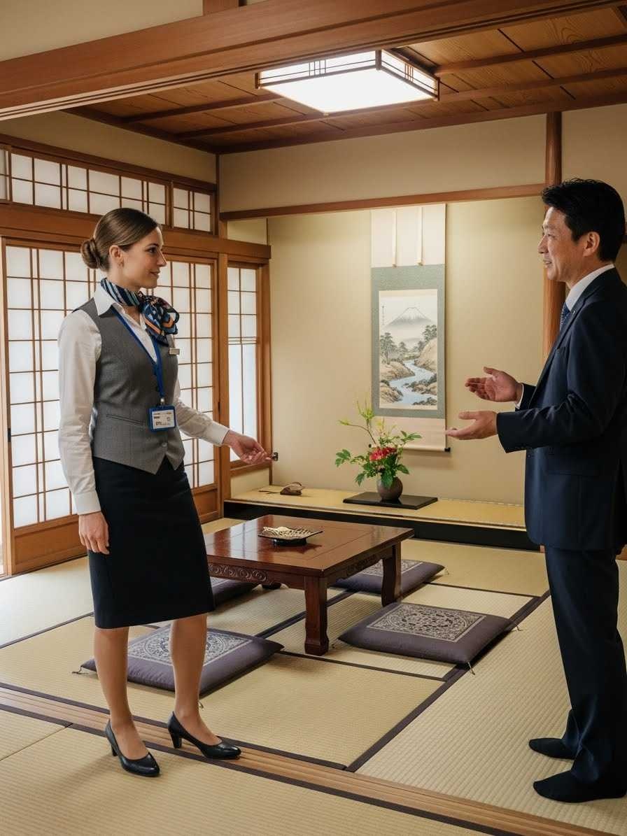 - 畳の部屋にヒールで上がる農協の共済のセールスレディの画像を作って。セールスレディはフランス人で
