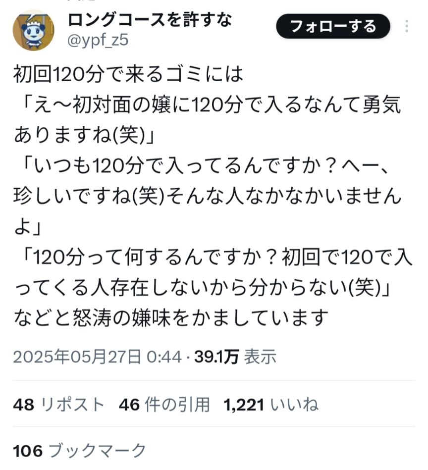 - 初対面ロングで会話やら指名料やらって話なんだろうけどそんなに嫌なら風俗やめるか良い店に行けばいい話なので