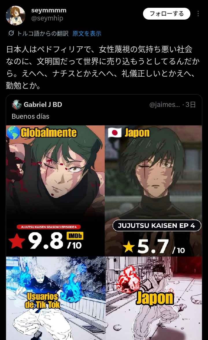 - アニメの内容で何かを語った気になるゲェジオタクは世界共通だな